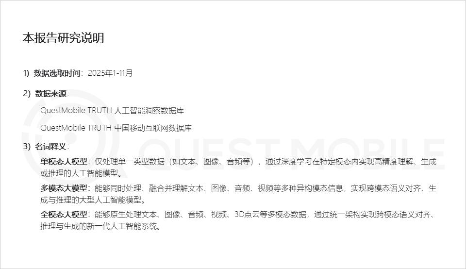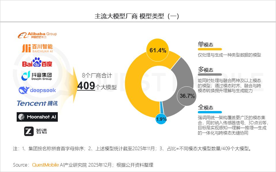 据公开资料显示,截至2025年11月,8个主流厂商旗下大模型中,全模态大模型占比为1.9%。