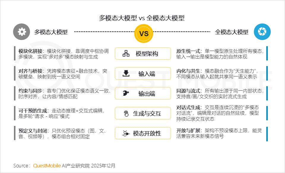 6、全模态大模型则强调“原生统一架构”,在输入、对齐、推理与输出全链路进行原生一体化处理