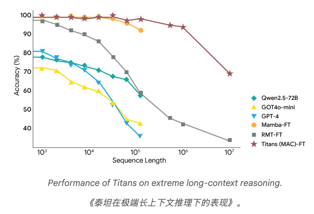 在这一充满挑战的环境中,Titans的表现优于所有基线,包括像GPT-4这样极其庞大的模型,尽管参数远少于GPT-4。