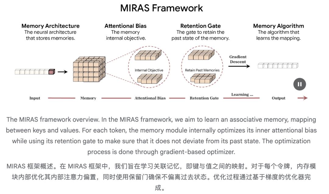 因此,MIRAS独特且实用的,在于它对AI建模的看法。它不再看到多样化的架构,而是看到解决同一问题的不同方法:高效地将新信息与旧记忆结合,同时不遗忘核心概念。
