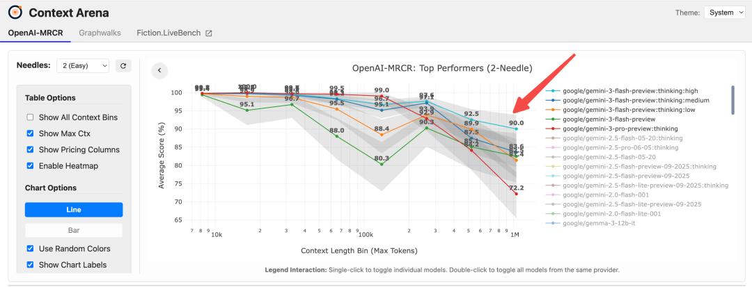 在Context Arena的MRCR榜单上,Gemini 3 Flash展现出了惊人的统治力。