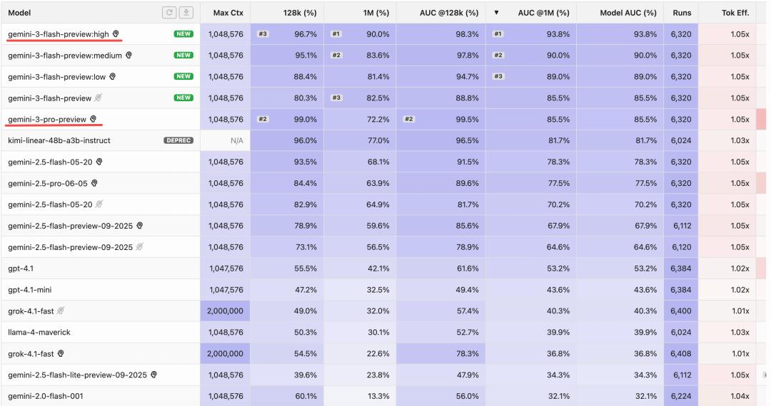 而且最近有人发现,在长下文测试中,Gemini 3 Flash更是遥遥领先!