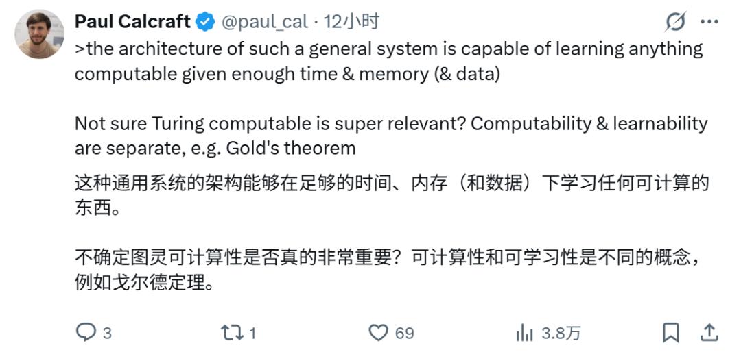 但关于通用性的重点在于:从理论上讲,在图灵机的意义上,这样一个通用系统的架构只要给予足够的时间和内存(以及数据),就能够学习任何可计算的事物。而人类大脑(以及 AI 基础模型)都是近似的图灵机。