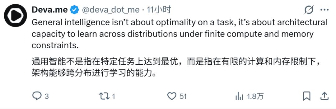 他认为 LeCun 混淆「通用智能」和「普适智能」。虽然「天下没有免费的午餐」(没有算法能完美解决所有问题),但人类大脑和 AI 基础模型近似于图灵机。只要给够时间、内存和数据,理论上啥都能学。