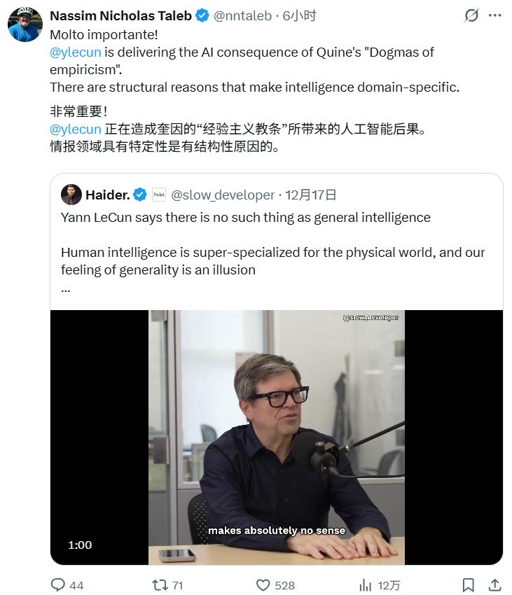黑天鹅理论(指极不可能发生,实际上却又发生的事件)之父 Nassim Nicholas Taleb 从哲学角度切入,认为 LeCun 实际上是在阐述 Quine 的经验主义教条在 AI 领域的投射。他认为任何智能都是「领域特定」的,逃不开进化和结构的束缚。