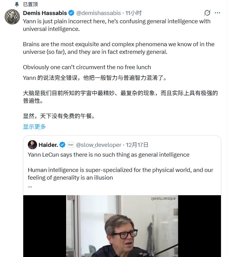 本来大家以为这只是 LeCun 的日常输出,没想到引来了另一位大佬:Google DeepMind 的掌门人 Demis Hassabis。