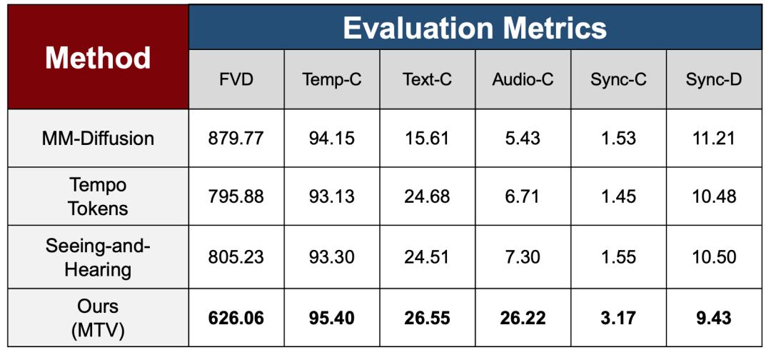 在多模态对齐层面,研究分别通过 Text-C 和 Audio-C 衡量视频与文本、音频之间的一致性。其中,MTV 在 Audio-C 指标上取得了明显提升,远高于对比方法,反映出音频解混与多流控制机制在强化音画对应关系方面的有效性。