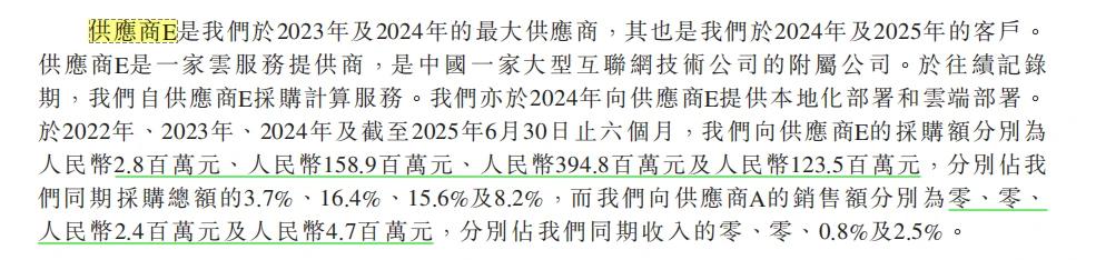 智谱的多个客户同时兼职供应商,一边向其供货一边签销售合同,涉及关联交易。据略大参考统计,智谱招股书中的客户A、供应商E、客户P、客户Q均出现了采购额超过销售额的情况,其中供应商E的情况格外突出。在2022年至2025年六月底期间,智谱共向供应商E采购了6.8亿元,但仅向其销售了不到0.01亿元。