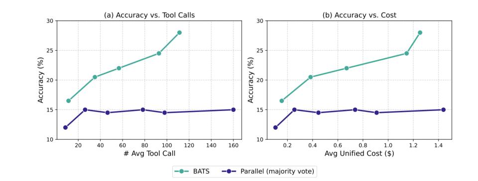 这套系统效果更好,BATS在BrowseComp上达到24.6%准确率,比标准ReAct的12.6%提升95%。在BrowseComp-ZH上达到46.0%,比31.5%提升46%。成本上,在相同准确率下,BATS的统一成本(Token消耗+工具调用)还是可以比并行投票方案低40%以上。