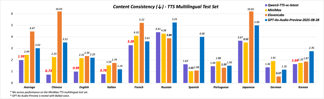 多语种音色克隆:在 MiniMax TTS Multilingual Test Set 上,Qwen3-TTS 在中、英、法、意大利等语项的内容稳定性优于 MiniMax、ElevenLabs 及 GPT-4o-Audio-Preview;其平均词错误率(WER)位居第一。