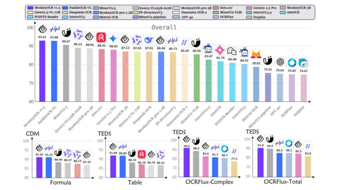 MonkeyOCR v1.5,正是这一演进路径上的新代表作。它在全能多模态文档解析基准OmniDocBench v1.5,OCRFlux-bench上,全面超越MinerU 2.5、PPOCR-VL、DeepSeek-OCR等此前最优方法,尤其在复杂表格场景中,相较于此前表现最好的MinerU2.5,效果提升近2.5%