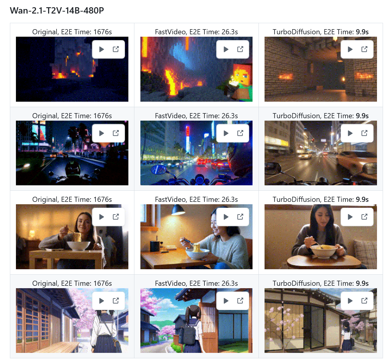 GitHub 页面公布的实测数据展示了惊人的性能跃升。在单张 RTX 5090 显卡上测试 Wan-2.1-T2V-1.3B-480P 模型,生成 5 秒视频的原版耗时为 184 秒,而 TurboDiffusion 仅需 1.9 秒。