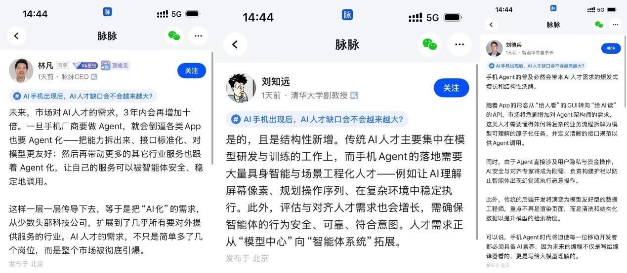 随着手机厂商推动Agent化,各类App及行业服务将跟进,使“AI化”需求从头部科技公司扩展至几乎所有服务行业。刘知远补充说,AI手机将带来人才需求的结构性新增,尤其需要具身智能、场景工程化及能在约束条件下创新、兼顾数据隐私的复合型人才。刘德兵进一步指出,未来市场将急需Agent架构师、AI安全与对齐专家,传统后端开发角色也将向模型友好型数据工程师演变,移动开发者均需具备AI素养。