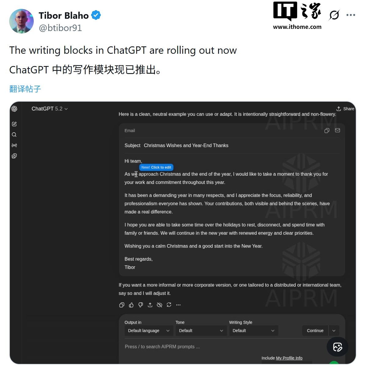 ChatGPT 为了实现这一目标,引入了一个全新的“格式化框”。具体而言,当用户在富文本区域(如邮件草稿或文章预览)高亮选中一段文字后,系统会自动弹出一个迷你编辑工具栏。IT之家附上相关截图如下: