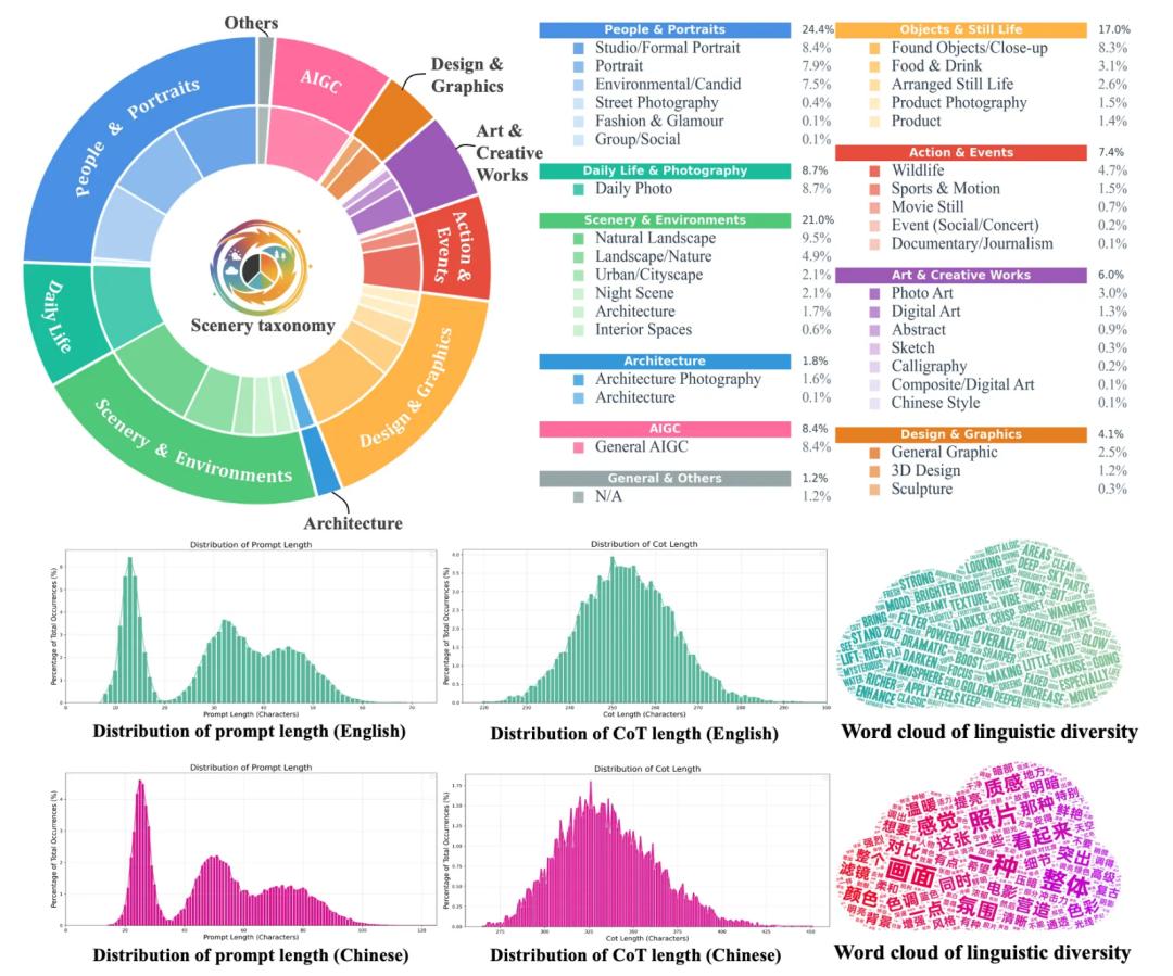 为了支撑上述训练,团队构建了ArtEdit——一个包含170K样本的双语(中/英)专业修图数据集。包含人像、风光、建筑、静物、夜景等10大类、37个子类的专业摄影场景。通过A2L (Agent-to-Lightroom) 协议,无缝集成了Adobe Lightroom中的200+个修图工具。