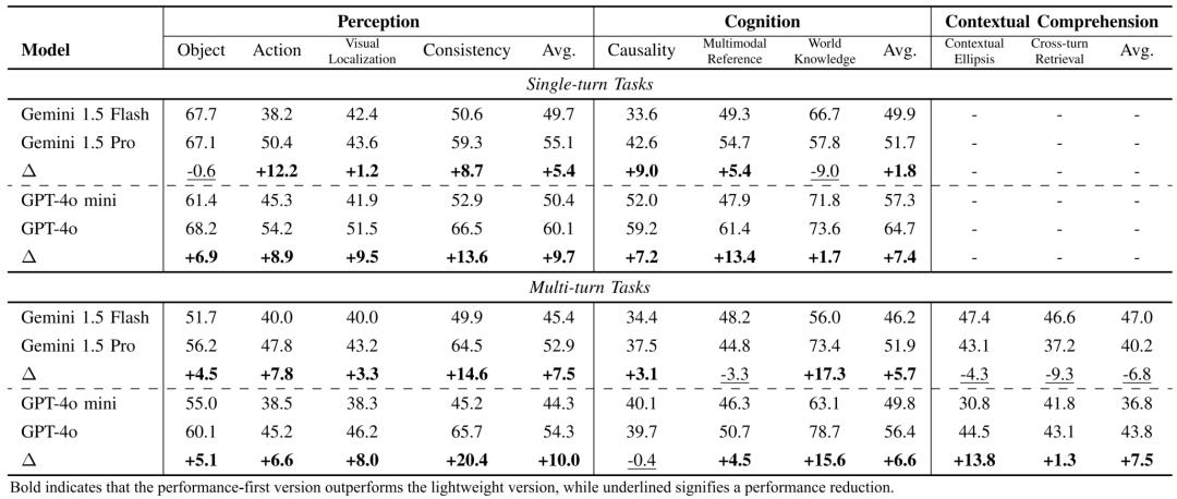 轻量版与性能版模型的权衡对比GPT-4o/GPT-4o mini和Gemini 1.5 Pro/Gemini 1.5 Flash发现,性能更强的版本在绝大多数任务上领先。
