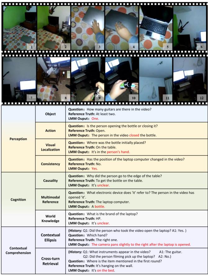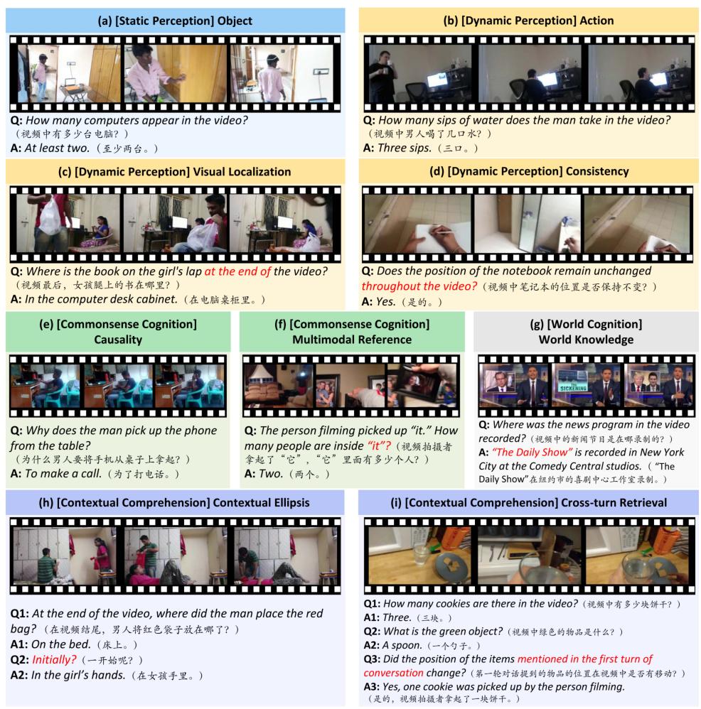 更重要的是,它引入了多轮对话评测(最多5轮),要求模型具备连贯的上下文理解、信息关联与指代消解能力,这是此前视频评测中普遍缺失的一环。