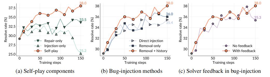 实验结果表明,完整的自博弈框架性能最优,而单一注入或修复训练均表现不足,前者缺乏从修复过程中的学习,后者受限于静态任务分布。相比之下,自博弈通过同时生成与修复 Bug,使任务分布随训练动态演化,持续提供更丰富的学习信号,从而实现稳定的性能提升。