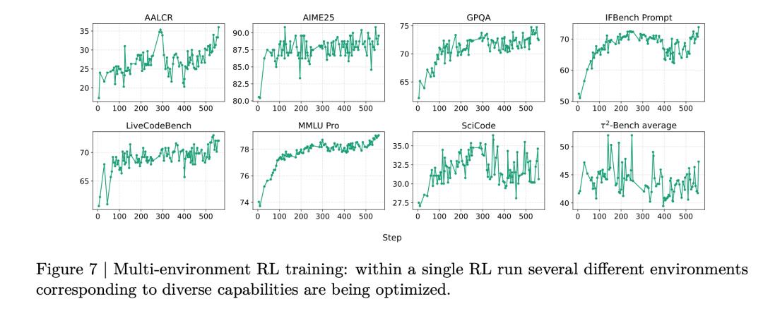 AIME25数学分数从80提升到90,LiveCodeBench从65提升到72,τ²-Bench工具使用从40提升到50左右,全程呈稳定上升趋势。