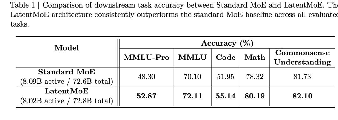 两者的总参数量和激活参数量几乎相同(都是8B激活、73B总参),但LatentMoE在所有下游任务上都取得了更好的成绩——MMLU-Pro从48.30提升到52.87,代码任务从51.95提升到55.14,数学任务从78.32提升到80.19。