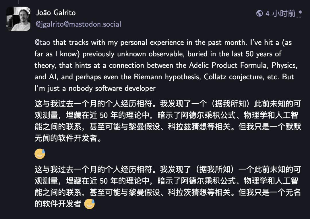 陶哲轩在Mastodon上对此事发表了看法。