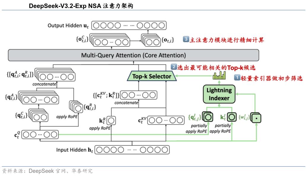 从当前技术演进看,Transformer架构在中短期内仍将是主流,其核心算法Attention机制(通过计算Tokens间相关性以预测最优输出),构成了模型性能的关键环节。因此,国内头部厂商普遍聚焦于Attention层面的优化与创新,其中以阿里的Qwen系列与DeepSeek的模型为典型代表。在算力约束难以短期突破的情况下,架构创新与算法精炼将成为国内基础模型竞争的主要方向。
