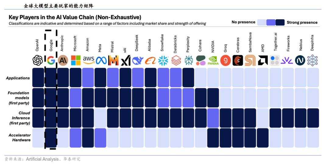 从现阶段表现看,Google在上述各维度的能力布局相对均衡且覆盖面广,体现为底层自研硬件(TPU系列)到应用的端到端一体化优势。相对而言,其他玩家也在逐步补齐短板,如OpenAI在底层定制化硬件方面暂处于落后位置,但是据路透社信息,OpenAI已宣布与博通合作开发新一代ASIC芯片,以期强化算力与成本控制的基础能力;国内DeepSeekV3.1及之后系列、智谱GLM4.6在Day0即适配了国产芯片。
