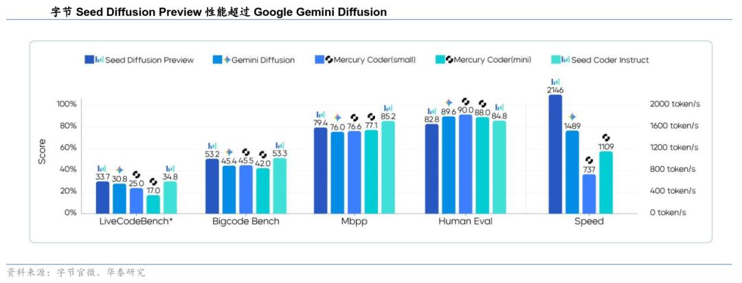 2024年初Sora的发布,展现了Diffusion与Transformer结合的潜力,显著提升了视频生成的一致性、分辨率及时长表现。25年5月,Google首次尝试将Diffusion算法用于文本生成,发布Gemini Diffusion预览版,字节随后也推出Seed Diffusion以跟进相关方向。目前有观点认为,字节Seed Diffusion Preview性能超过Google Gemini Diffusion。
