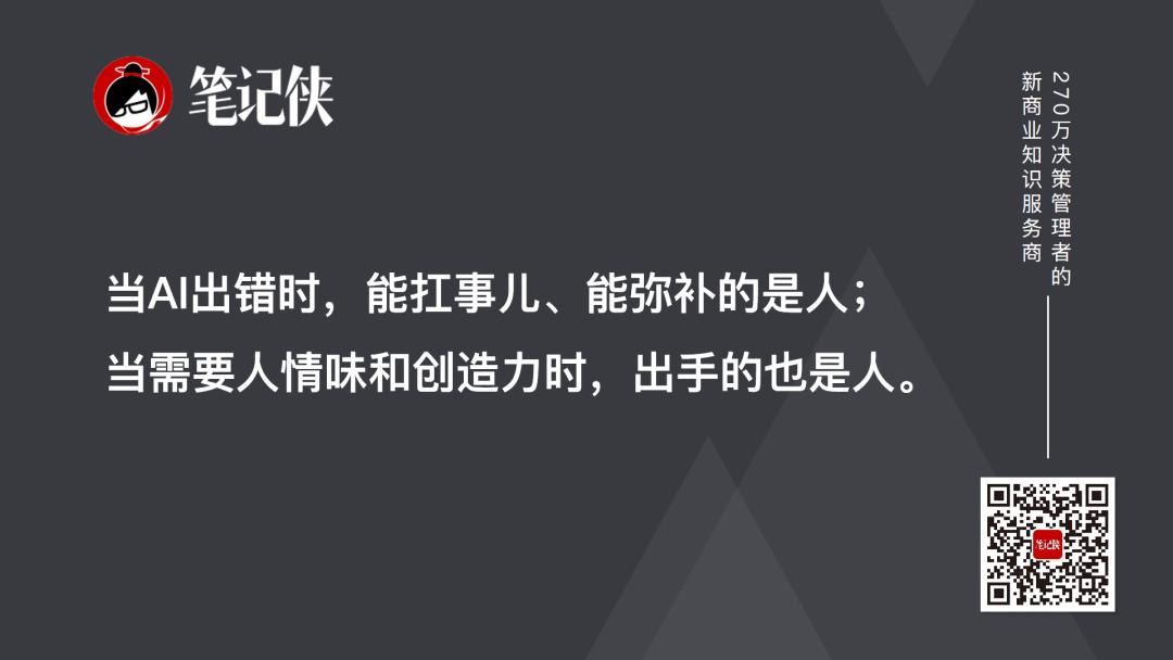 用我(笔记侠编辑)的工作来设想一下吧。未来,AI可能一秒就能生成一篇事实准确、结构清晰的报道。那我去干嘛呢?我可能变成了“内容策展人”和“意义赋予者”——用AI快速梳理出事件全貌,然后去现场寻找AI察觉不到的情绪,采访AI问不出的尖锐问题,写出充满人性洞察的评论。