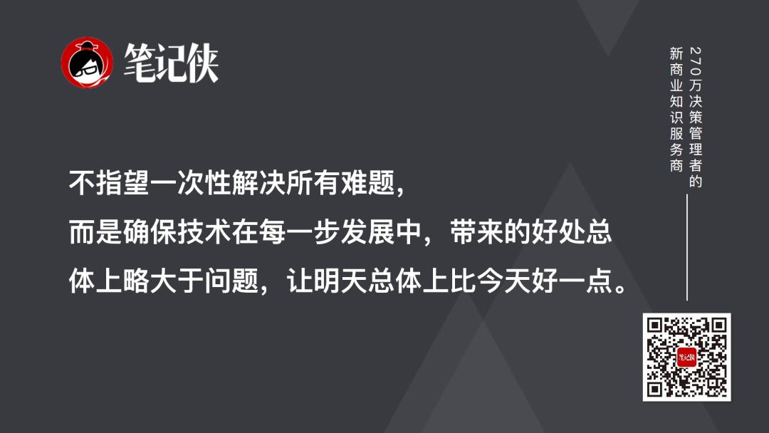 这些问题都没有标准答案。但凯文·凯利的“进托邦”思想提供了一种务实的态度:不指望一次性解决所有难题,而是确保技术在每一步发展中,带来的好处总体上略大于问题,让明天总体上比今天好一点。
