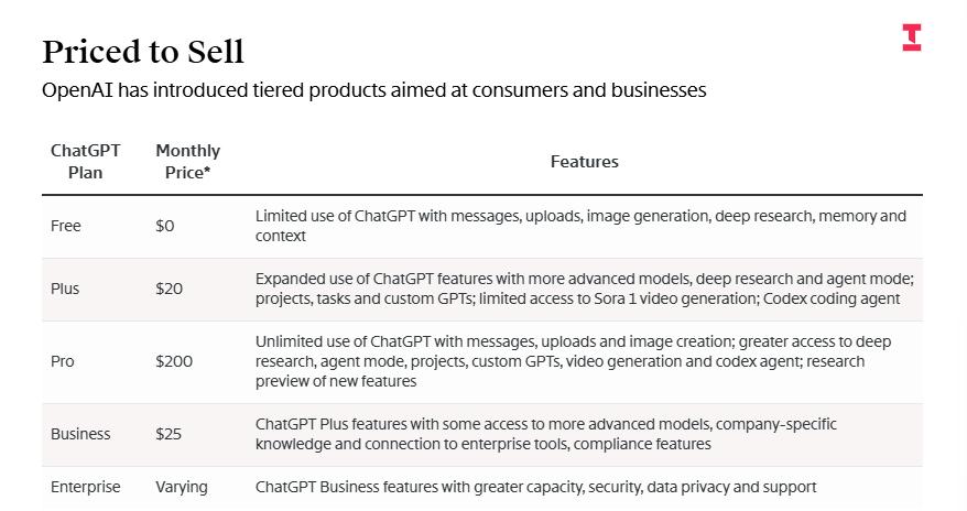 图:OpenAI已针对消费者和企业市场推出了分级产品