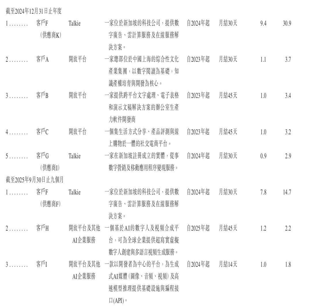 这其中,MiniMax合作的前五大客户也在招股书中进行了相应披露,比如2023、2024年都位列前五的小红书、阅文集团和金山办公(WPS),2025年的企业指向性不强,比较明显的是一家AI数字人及视频合成平台,结合MiniMax披露信息推测为Veed。