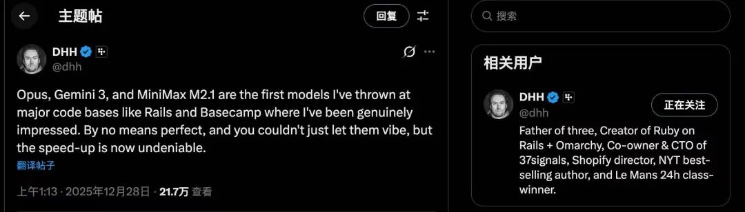 “(Claude)Opus、Gemini 3和MiniMax M2.1是首批被我用于Rails、BaseCamp等代码库中的模型,在使用过程中我感到非常震撼。”创建Web开发框架Ruby on Rails的传奇程序员DHH在X上给出了评价。