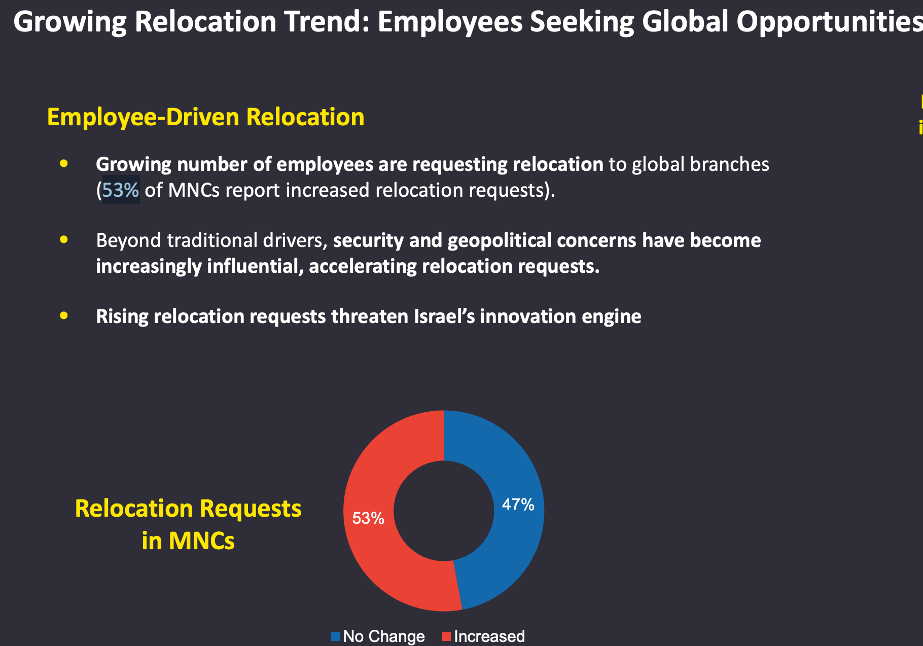 而且,报告同时指出,跨国公司的高管及其家庭对调职海外的需求有所增加,越来越多员工申请在以色列以外的职位。