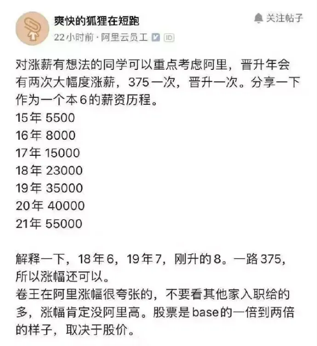 曾有自称阿里云员工的网友,列出了自己从2015年-2021年的薪资历程,仅6年时间,这名阿里员工的薪资便涨了近9倍。