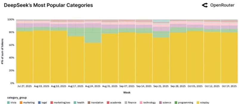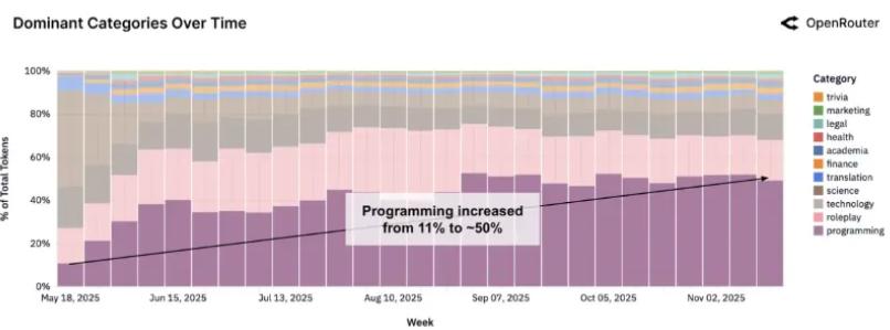 •编程:与代码编写相关的查询已成为增长最稳定的类别,从2025年初约占总令牌量的11%增长到最近几周在平台所有模型中超过50%。编程工作负载被认为是令牌量快速增长的主要驱动力,输入令牌量经常超过20,000个。