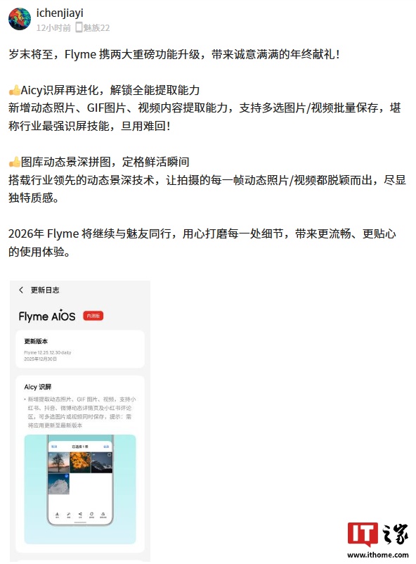 IT之家注意到,陈家沂分享的图片显示,此次官宣的魅族 Flyme AIOS 2 年末版本目前为内测版(版本号:Flyme 12.25.12.30 daily),具体更新内容如下:
