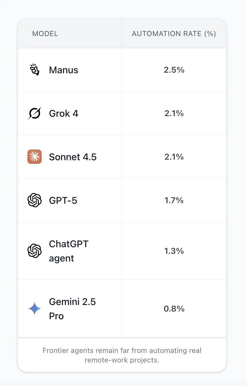 在Scale AI今年10月发布的“远程劳动力指数”评测中,Manus以2.5%的自动化率拿到了SOTA(当前最优水平)。