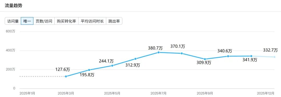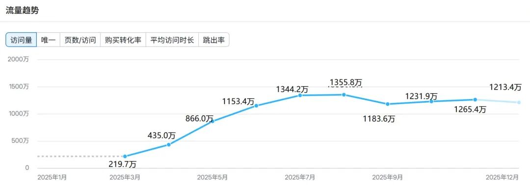 《每日经济新闻》记者(以下简称每经记者)查询数据分析平台Semrush发现,自今年3月发布以来,Manus访问量持续攀升,8月创下1355.8万月访问量峰值,随后小幅回落,进入第四季度后流量走势平稳,稳定在千万级规模。其独立访客数于7月达到年度高点380.7万,经历短暂回调后,第四季度同样趋于平稳,始终保持在300万量级以上,形成了稳定的核心用户池。核心应用场景集中于研究分析、处理CSV文件和潜在客户信息抓取等数据整理工作。