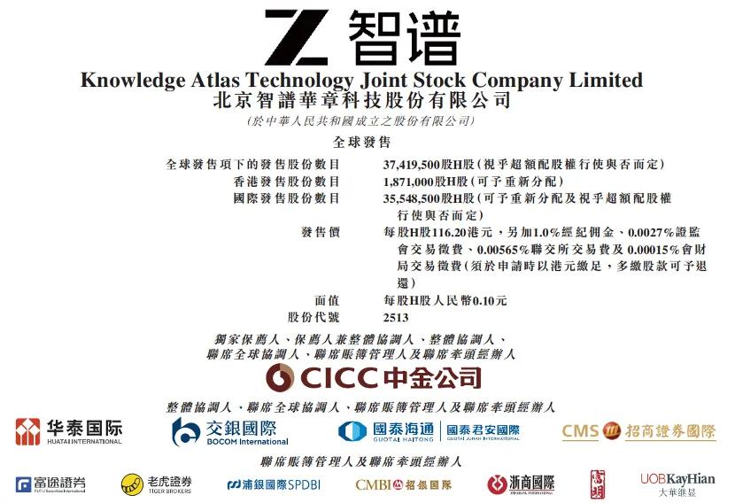 按照招股书披露,智谱此次IPO拟发行37,419,500股H股,其中香港公开发售1,871,000股,国际发售35,548,500股。若按每股116.2港元的发行价计算,本次募资规模预计约43亿港元,对应IPO市值有望超过511亿港元(均不计“绿鞋”机制)。