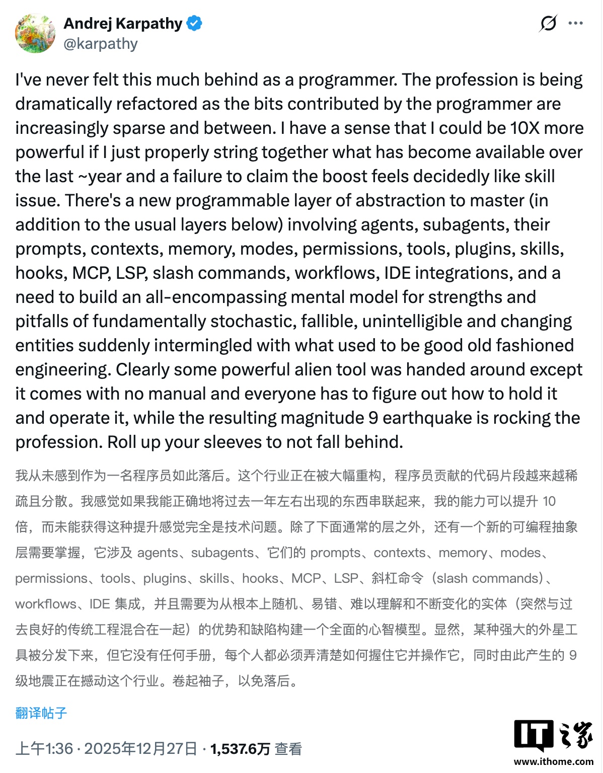 他认为,随着 AI 接管越来越多具体编码工作,软件行业正在经历一次彻底重塑。个人程序员亲手写下的代码越来越少,而真正的差距,正在体现在是否懂得如何高效使用新工具上。卡帕西直言,如果不能把过去一年涌现出来的能力充分整合起来,“那基本就是技能的问题”。反之,如果自己能做好整合,那么能力就会“提高 10 倍”。