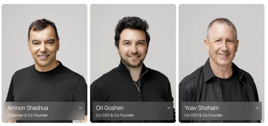 三位联创分别为:董事长Amnon Shashua、联合CEO Ori Goshen、联合CEO Yoav Shoham。