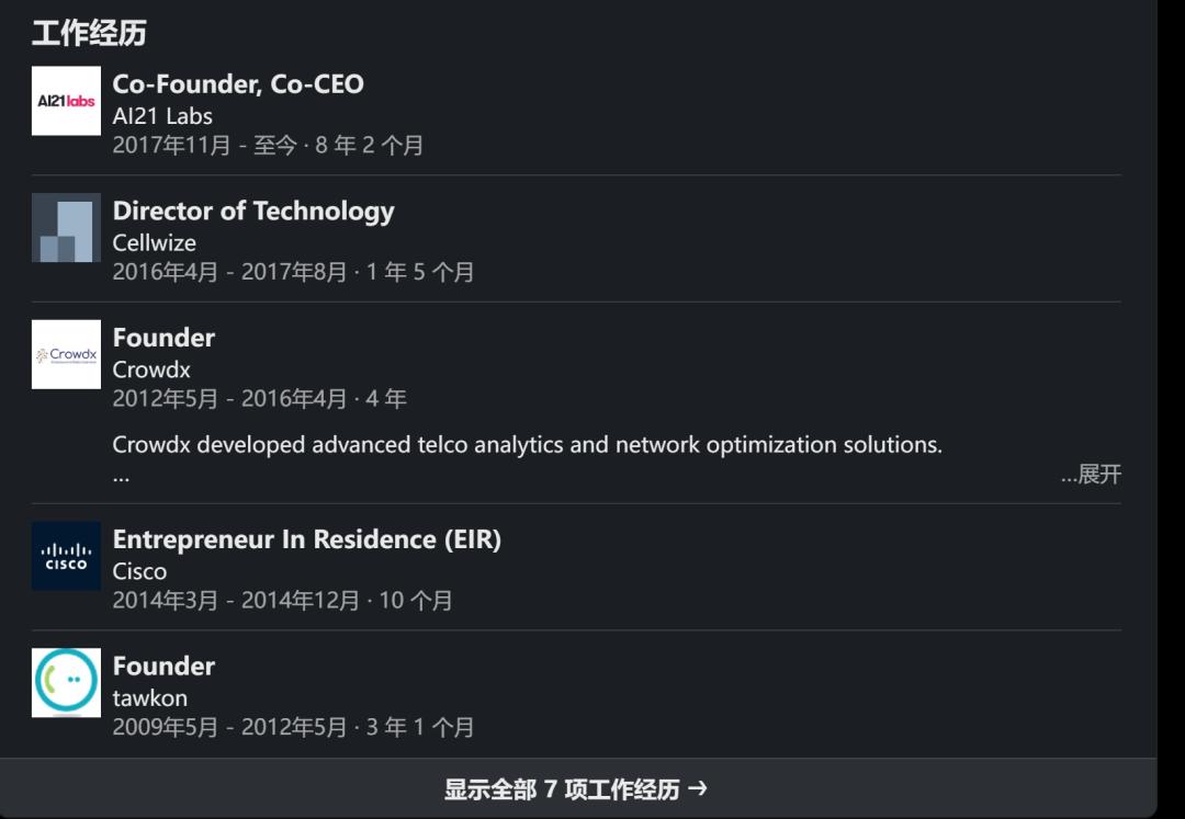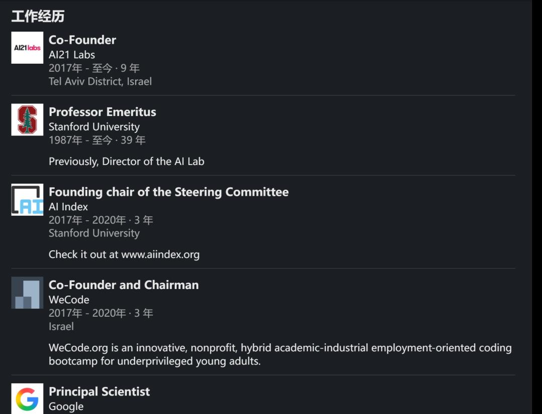 个人主页显示,包括AI21 Labs在内,他现在一共领导并积极参与着5家公司的运营。