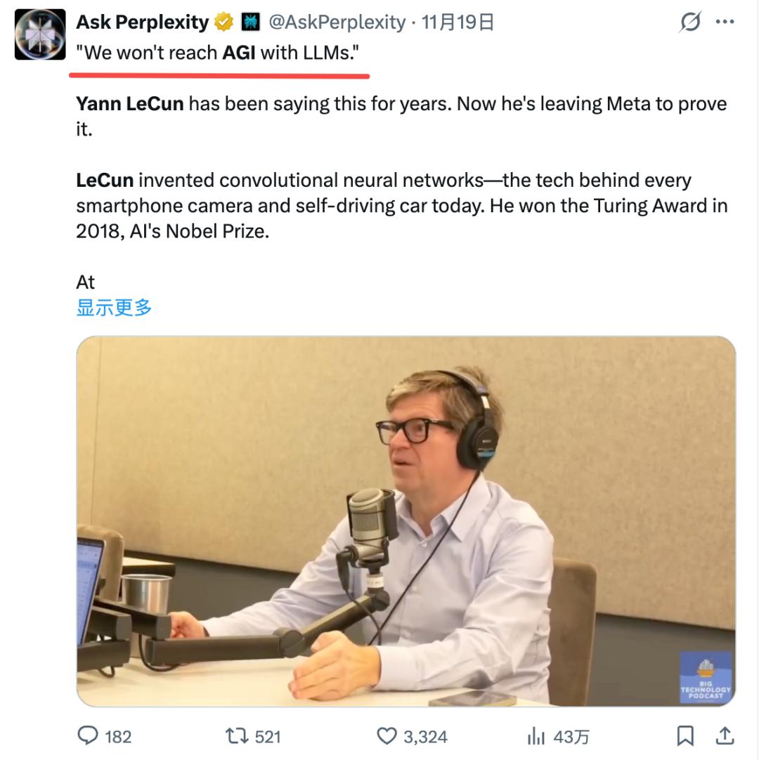 Yann LeCun则一如既往地毒舌,认为当前的大语言模型无论怎么Scaling都无法触达真正的AGI。