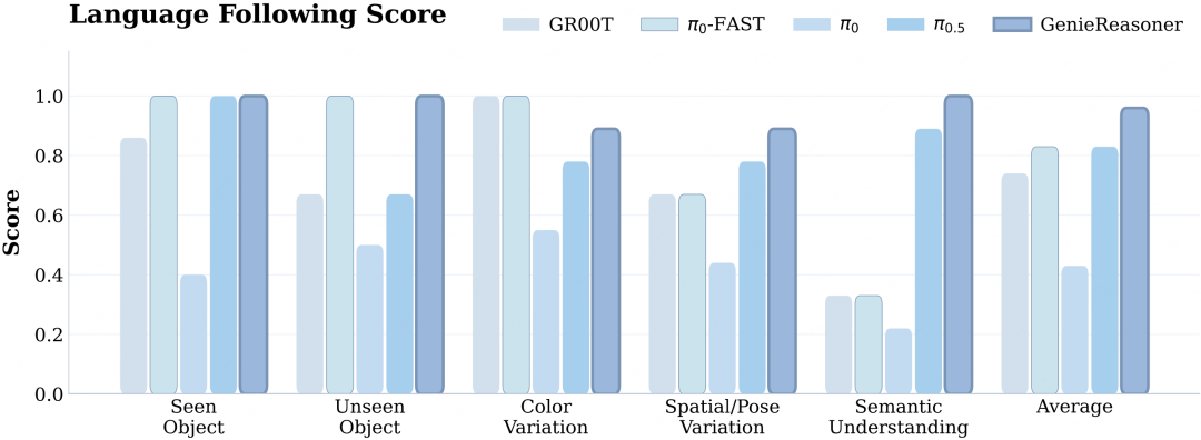 实验表明,GenieReasoner 不仅在推理能力上达到 SOTA,更在跨本体真机实验中展现了 SOTA 级别的泛化性。进一步的对比实验证实:VLA 模型更强的具身推理能力可显著提升其端到端动作执行表现,从而验证了 ERIQ 的评估价值。