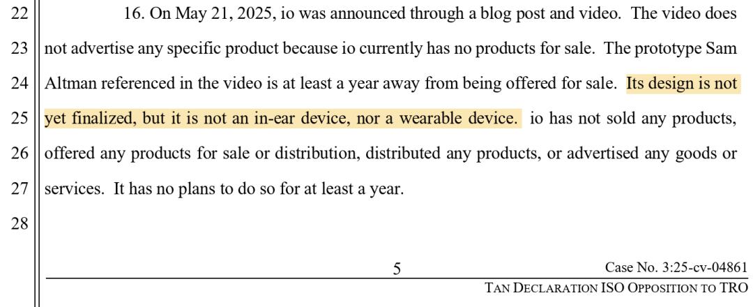 io 联合创始人兼首席产品官 Evans Hankey 在法庭声明中明确表态:「io 目前并无推出定制耳机的计划。」另一位联合创始人 Tang Tan 则直接划清界限:io 产品原型既非入耳式设备,也不是可穿戴设备。