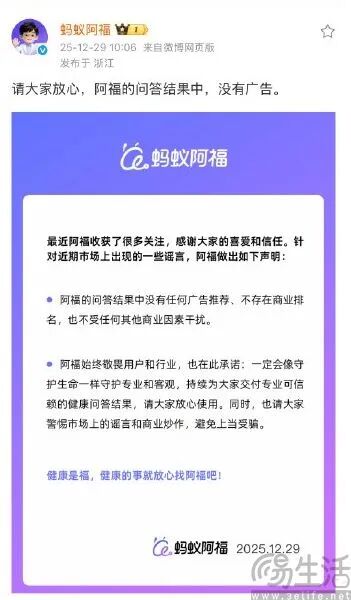 “阿福的问答结果中没有任何广告推荐、不存在商业排名,也不受任何其他商业因素干扰”,针对外界猜测回答结果中是否会有商业广告,蚂蚁集团的AI健康应用“蚂蚁阿福”日前做出了这样硬气的声明。