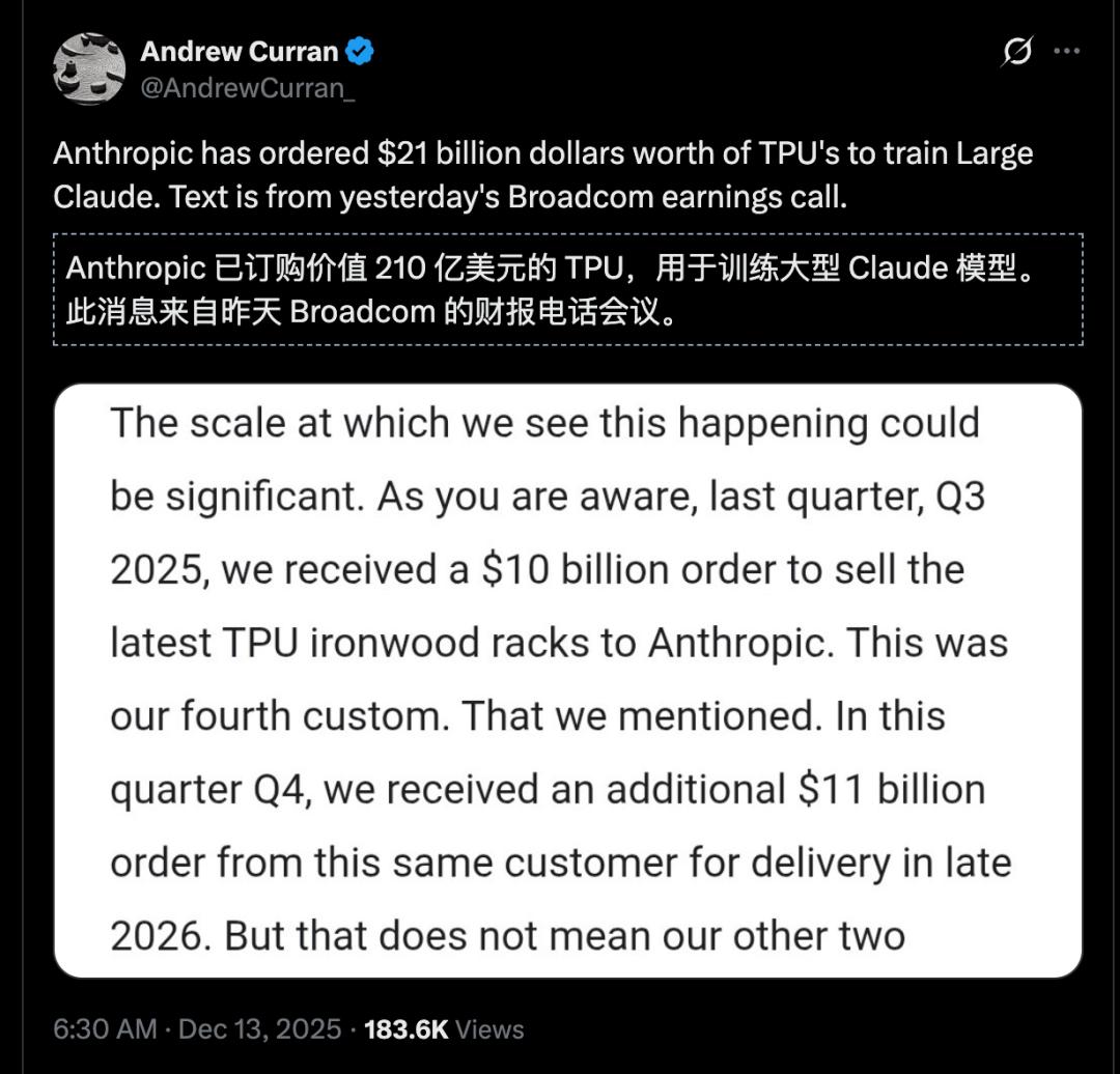 Anthropic一出手就是100万张,此前爆料称,这笔交易金额或达210亿美元。