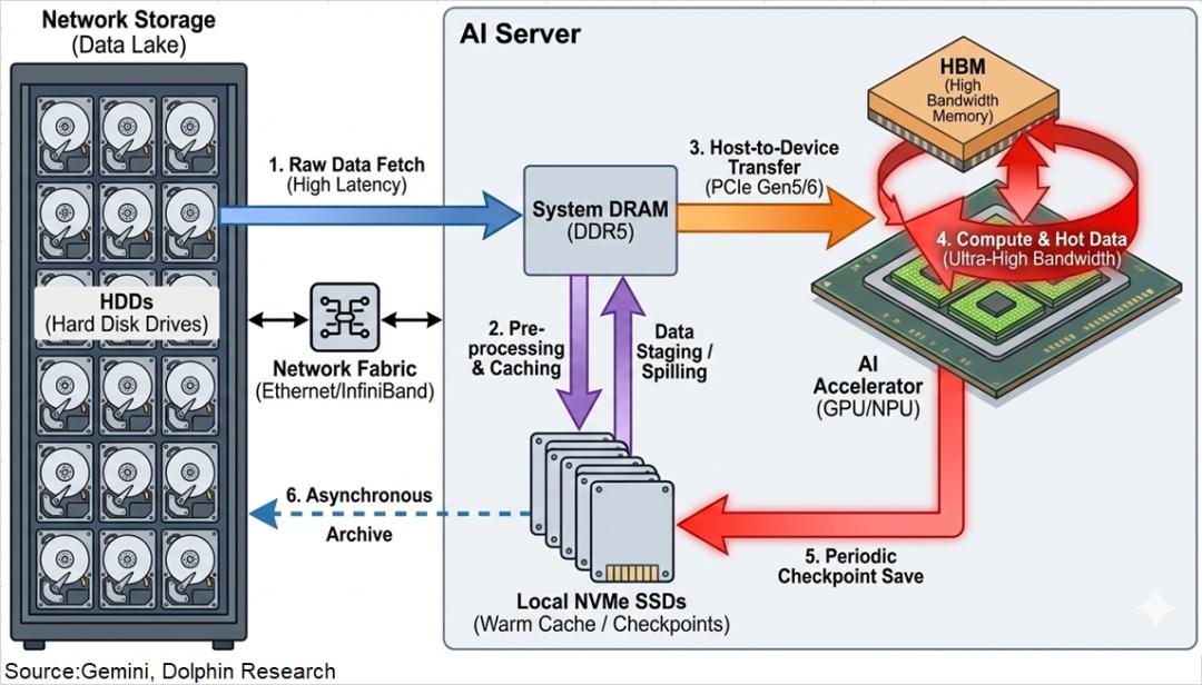 各类存储产品在AI服务器中都是什么角色呢,具体来看: