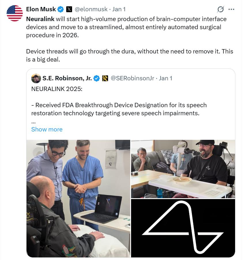 新年伊始,科技圈被埃隆·马斯克的一则声明再次引爆:Neuralink宣布正式开启“全自动穿刺”手术的量产化进程,并承诺将手术成本压至极低的价格区间。